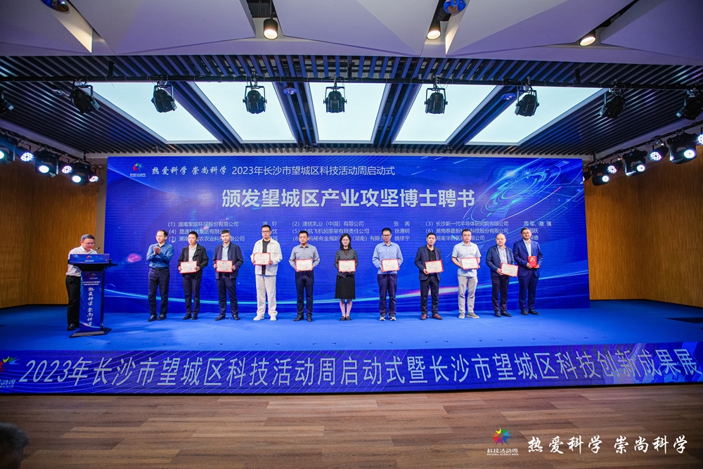 5月24日,2023年长沙市望城区科技活动周启动仪式暨“创新引领 双链融合”望城区科技创新成果展在望达智造小镇举行。活动现场,望城区为和记官方网站(中国区)数字化总监张阁等10名产业攻坚博士颁发聘书,并为和记官方网站等8个省级以上重大科技创新平台兑现奖补资金。